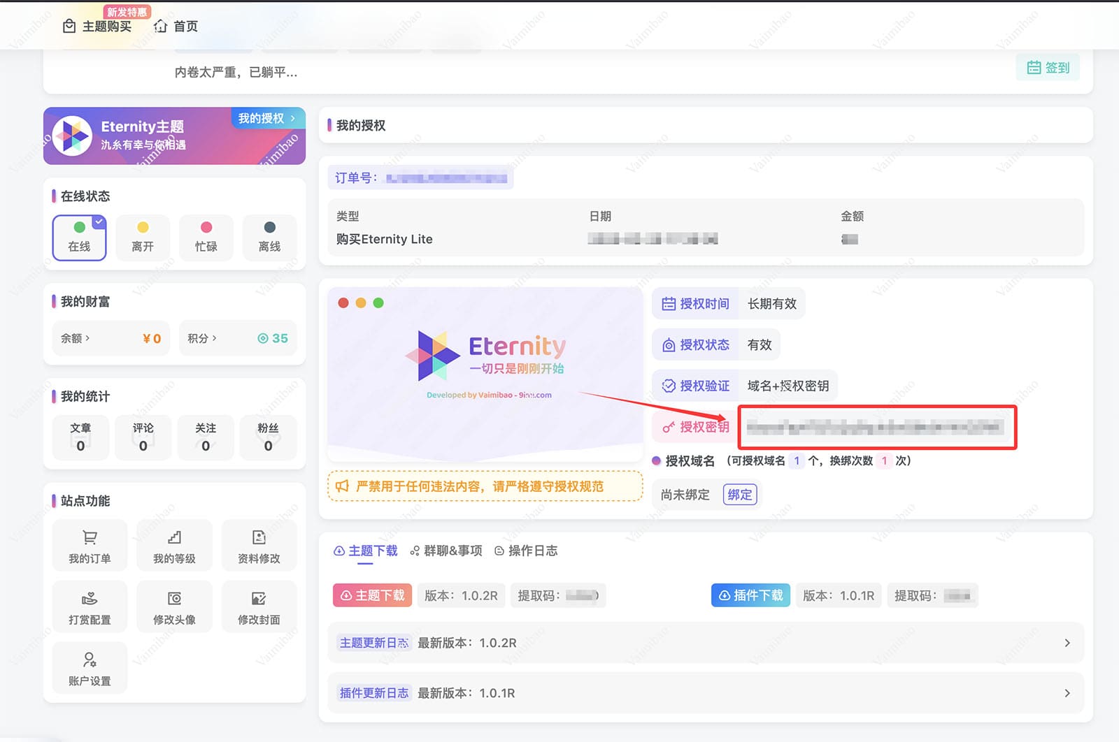 ❓ 激活问题❓ 激活问题 主题激活逻辑主题采取【授权密钥】+ 【绑定域名】方式验证 白屏问题?如果主题启用后白屏,后台进不去,那是扩展安装错误。请仔细查看【扩展安装教程】 去个人空间 -> 我的授权,首先,绑定你的域名,然后复制授权密钥 再前往主题设置 - 模板设置 - 主题激活,填入密钥。再次访问前台即可完成授权