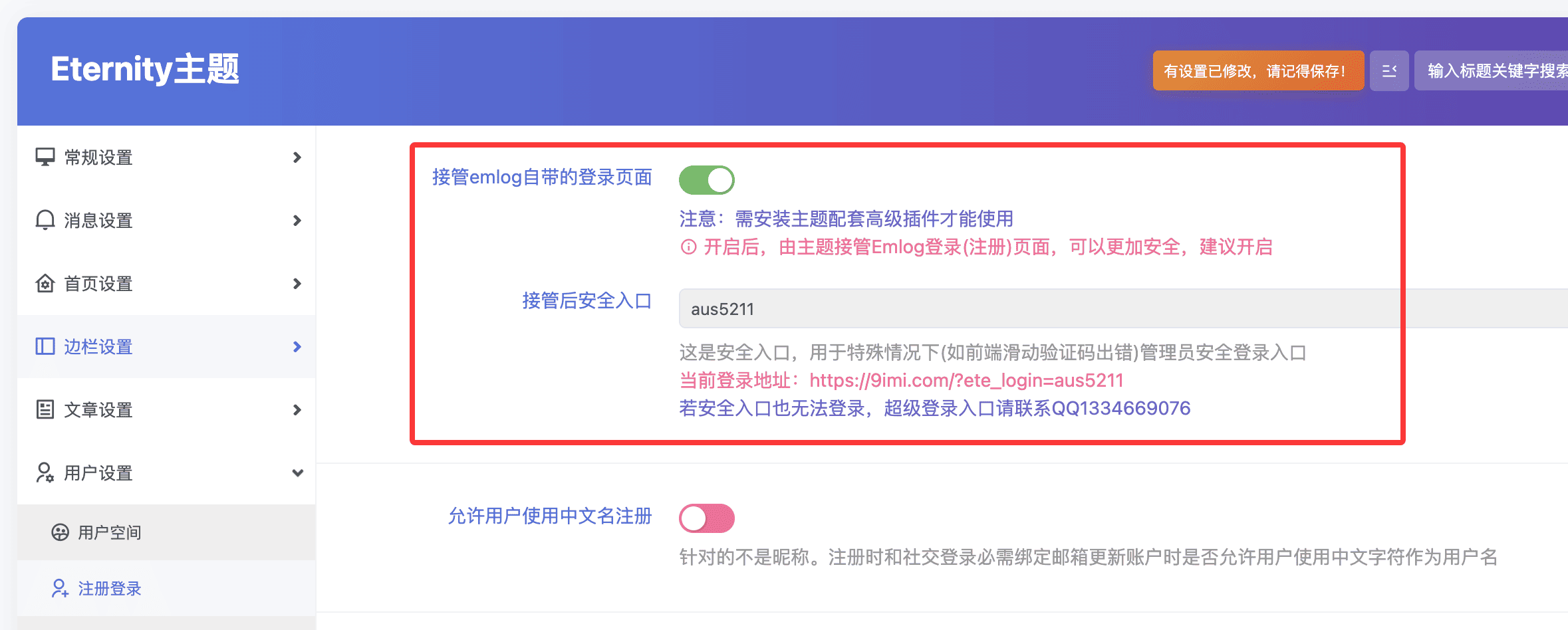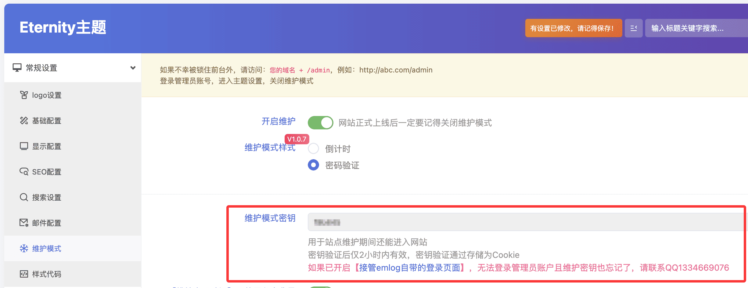 ❓ 常见问题本页总览❓ 常见问题 维护模式(admin后台进不去) 联系我们如下图所示,主题安装后默认开启【接管emlog自带的登录页面】,请设置后台入口为你需要的。 如果忘记了,进不去后台(下图维护模式忘记秘钥,进不去首页),可以点击联系我们