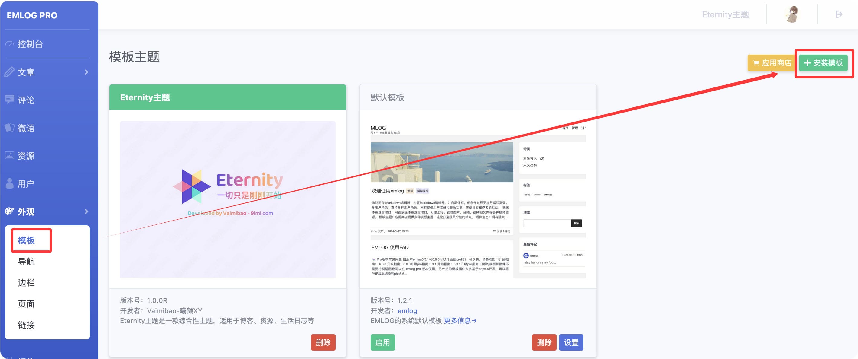 - 前往后台安装或更新主题。外观 - 模板 - 安装模板