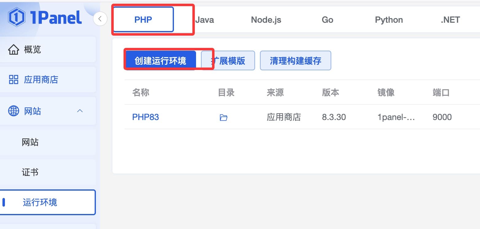 安装教程🍟 环境准备本页总览🍟 环境准备 宝塔安装 安装必要的软件 安装扩展,请仔细查看【扩展安装教程】 1Panel安装 安装必要的软件 首先创建 PHP 环境 环境创建必装扩展。首先选择 wordpress 模板,再多勾选下面的