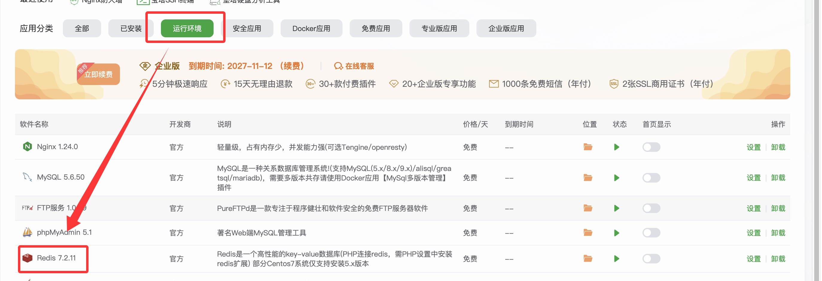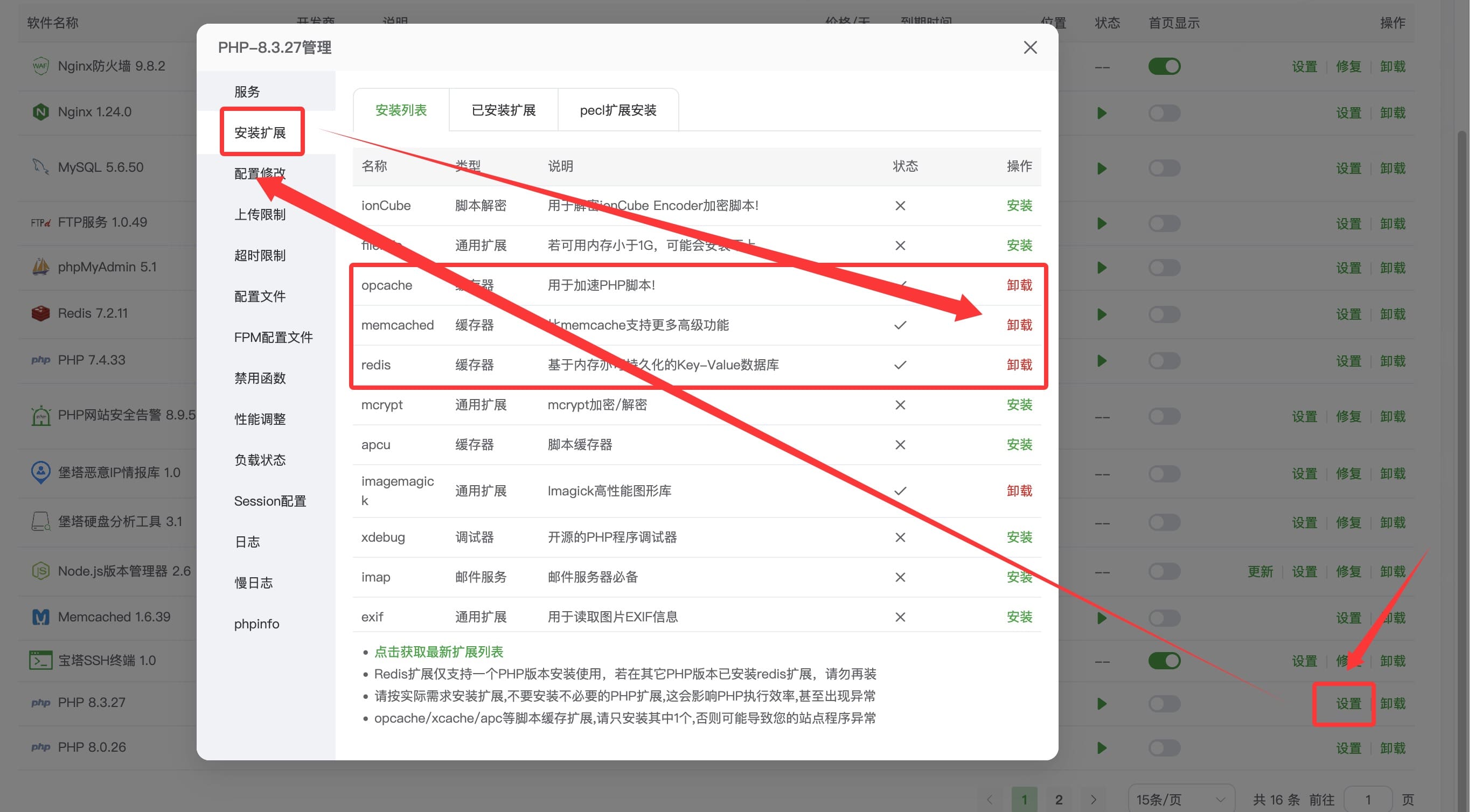 配置教程🚀 优化加速本页总览🚀 优化加速 版本限制该功能需要【Eternity Pro】2.0.0Dev+才能使用,下方以宝塔为例 首先安装PHP扩展 找到站点使用的PHP,点击设置,安装下图扩展 安装好了,重启PHP服务 安装Redis软件 在宝塔应用商店找到如图Redis软件并安装 最后主题设置一下 按需使用